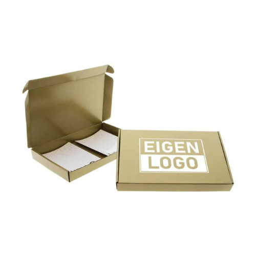 Gouden brievenbusdoosje. Mogelijk met jouw logo. Dit product is alleen te bestellen in combinatie met onze kaas en delicatessen.